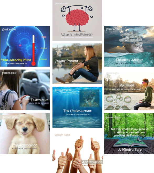 Each session explores themes such as ‘Your amazing mind’ (which looks at the developing adolescent brain with its different trajectories of emotional development and development of executive function and explains that our brains are hardwired for survival rather than happiness, so these tricky minds are ‘not our fault’), ‘Staying present’, ‘Dropping anchor’ into the present moment (using the support of breath, body or sound), distraction, attitude, appreciation, and what it might mean to live a mindful life – one that is in alignment with what we value. Self-compassion (i.e. directing kindness towards ourselves when things are difficult) is woven throughout the fabric of the course.